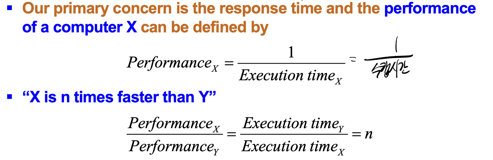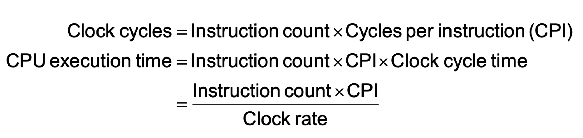 - Clock rate (or clock frequency- clock cycle time의 역수) : cycles per sound (ex)4GHz)