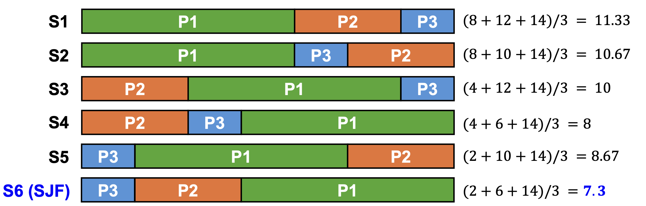 P1(8초), P2(4초), P3(2초) 세 작업이 있다고 가정해 봅시다.