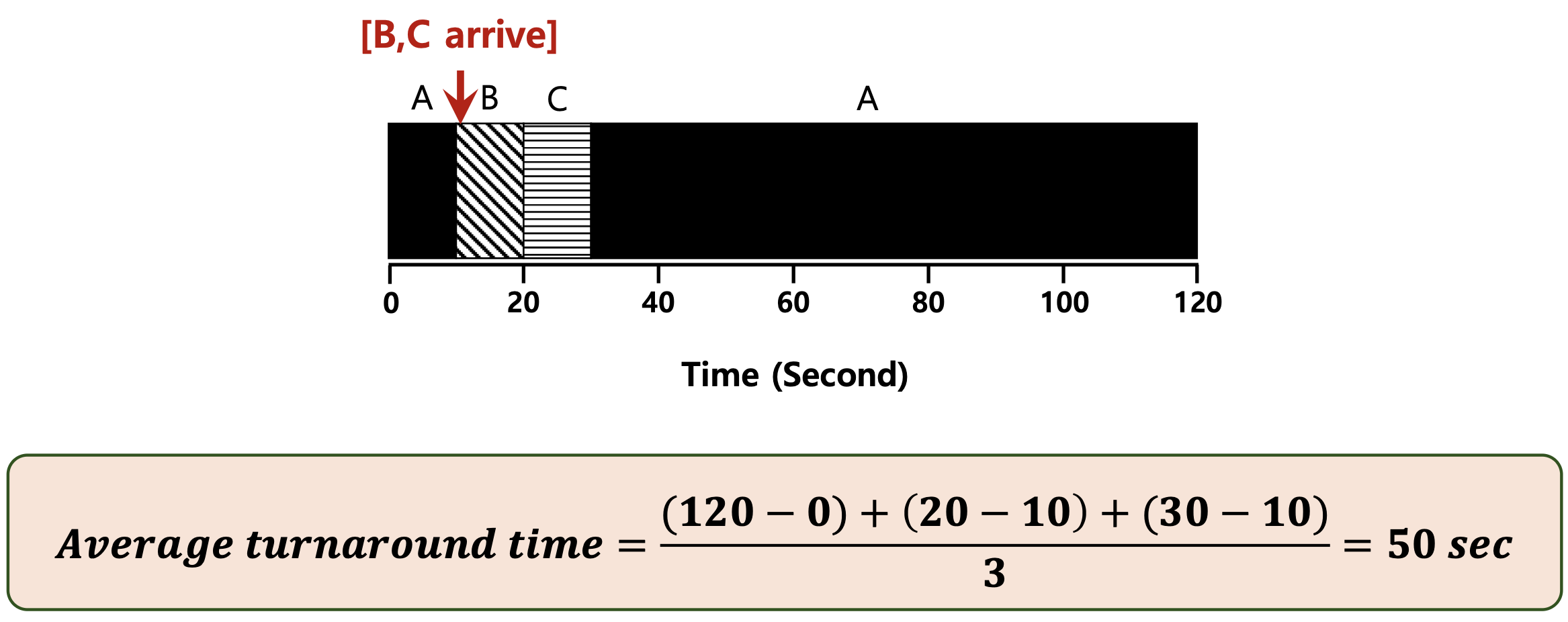 평균 turnaround time은 (10 + 20 + 120) / 3 = 50초입니다. 이는 FIFO의 110초보다 훨씬 효율적입니다.