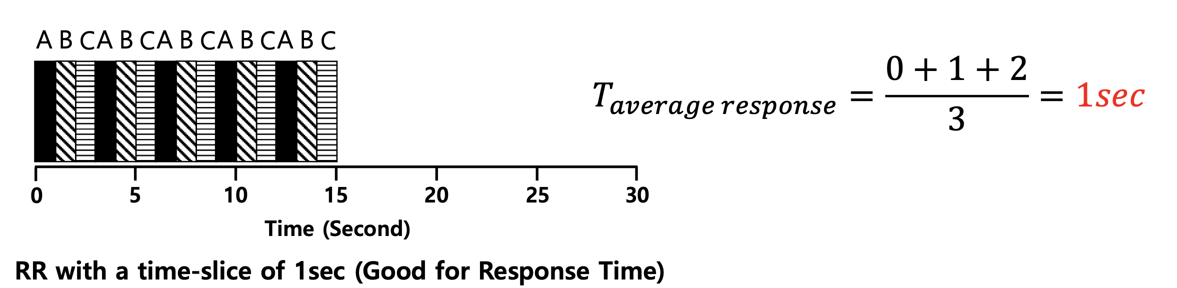 이 예시에서 볼 수 있듯이, RR은 SJF보다 평균 response time이 훨씬 빠릅니다.