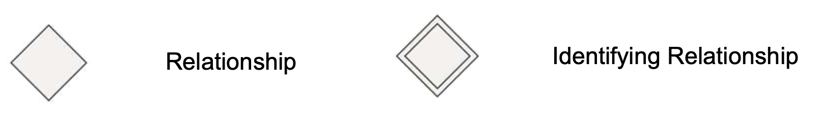 - 식별 관계 (Identifying Relationship): Weak Entity와 Owner Entity를 연결하는 관계를 식별 관계(Identifying Relationship)라고 하는데, 이는 이중 마름모꼴로 표현한다.