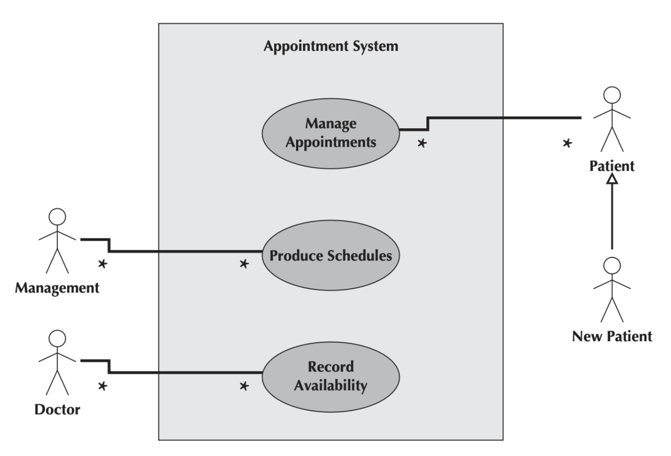 appointment system의 Use-case diagram을 보자. 보통 주요한 Use-case에 대해서 activity diagrams를 그린다. 여기서는 Manage Appointments에 대해서 그려보자.