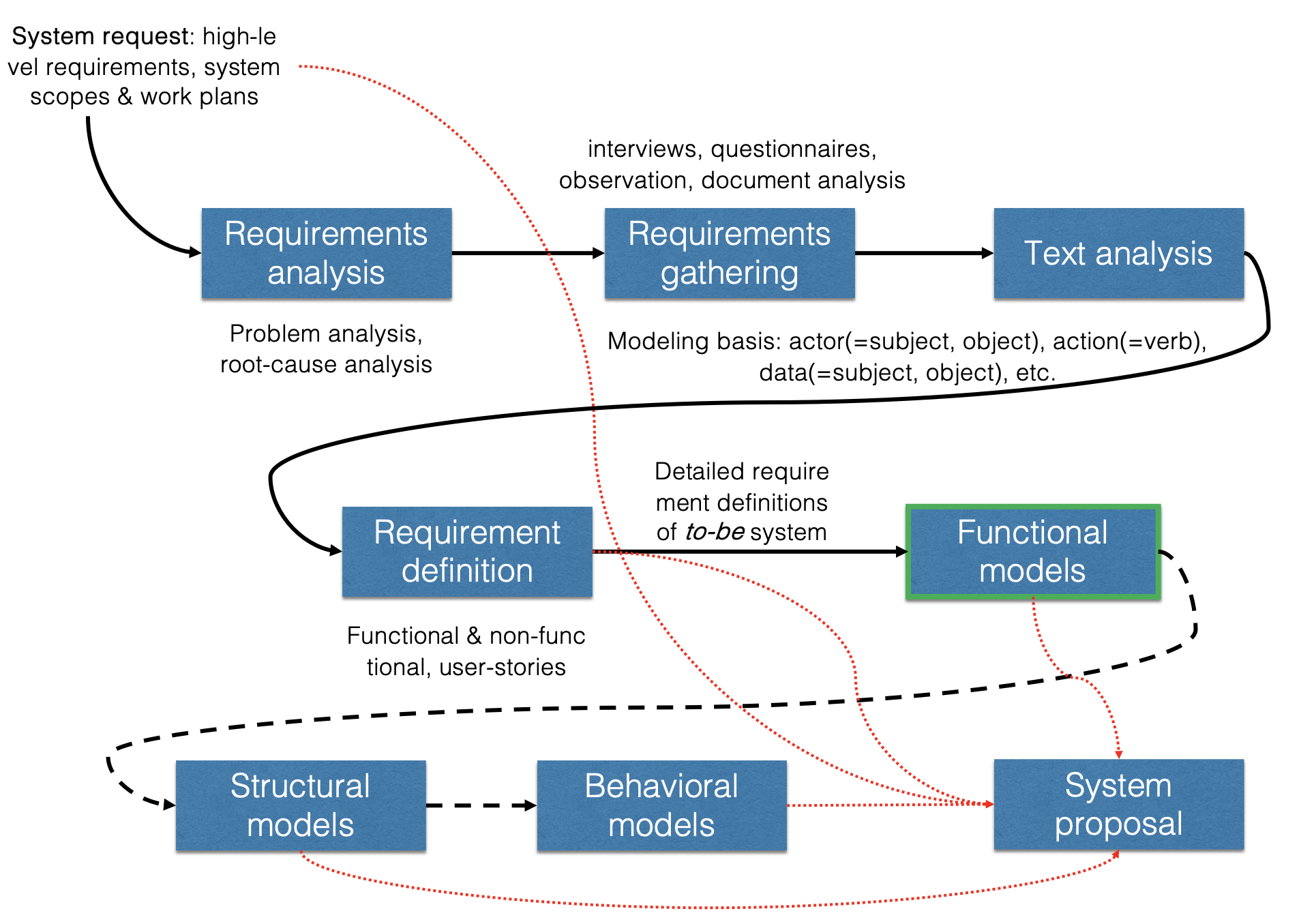 우리가 요구사항을 기능 모델로 바꾸는 과정은, business process들을 외부 관점에서 파악하기 위해 use-case를 개발하고, 그 유스케이스들을 모델링하기 위해 activity diagram을 만드는 순서로 진행된다.