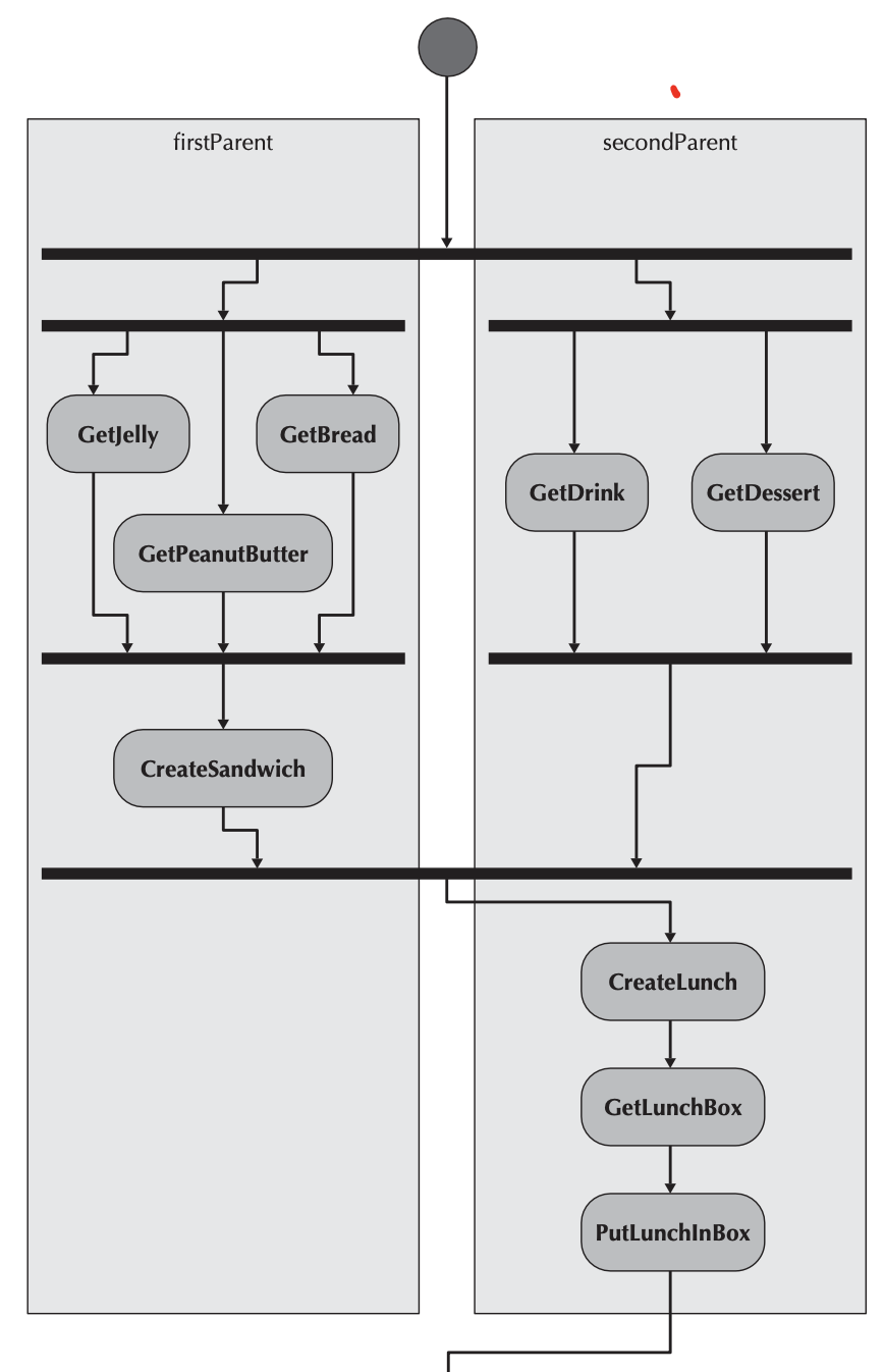 액티비티 다이어그램에 Swimlanes을 추가하면, 누가 그 활동을 수행하는지 책임(responsibility)을 할당할 수 있다. 이는 객체 또는 개인 간의 역할 분리(separation of roles)를 나타내며, 수평 또는 수직으로 그릴 수 있다. 책임 분리를 통해 병렬적으로 처리가 가능하고 효율성이 증가한다.