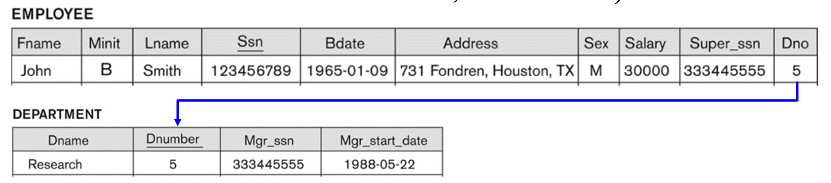 - 예시: EMPLOYEE 튜플의 Dno(부서 번호) 값은 반드시 DEPARTMENT 릴레이션의 Dnumber 값 중 하나와 일치해야 한다.