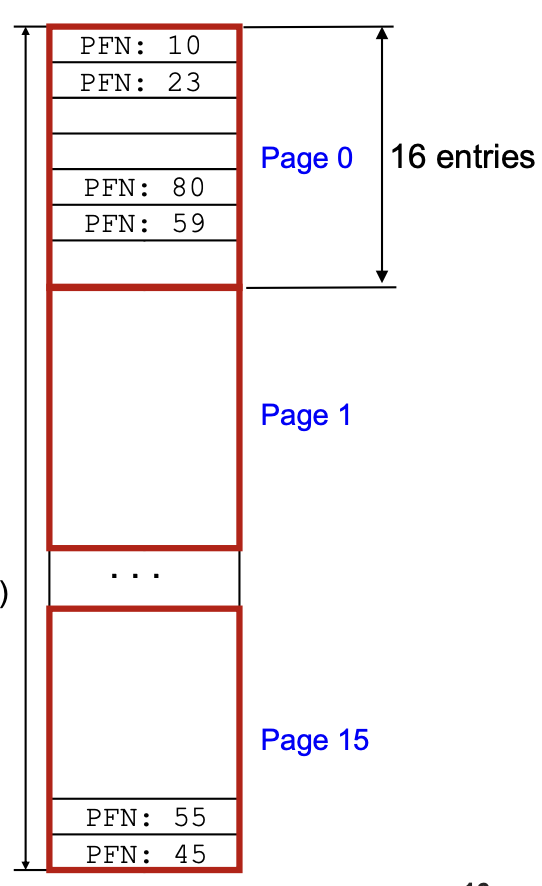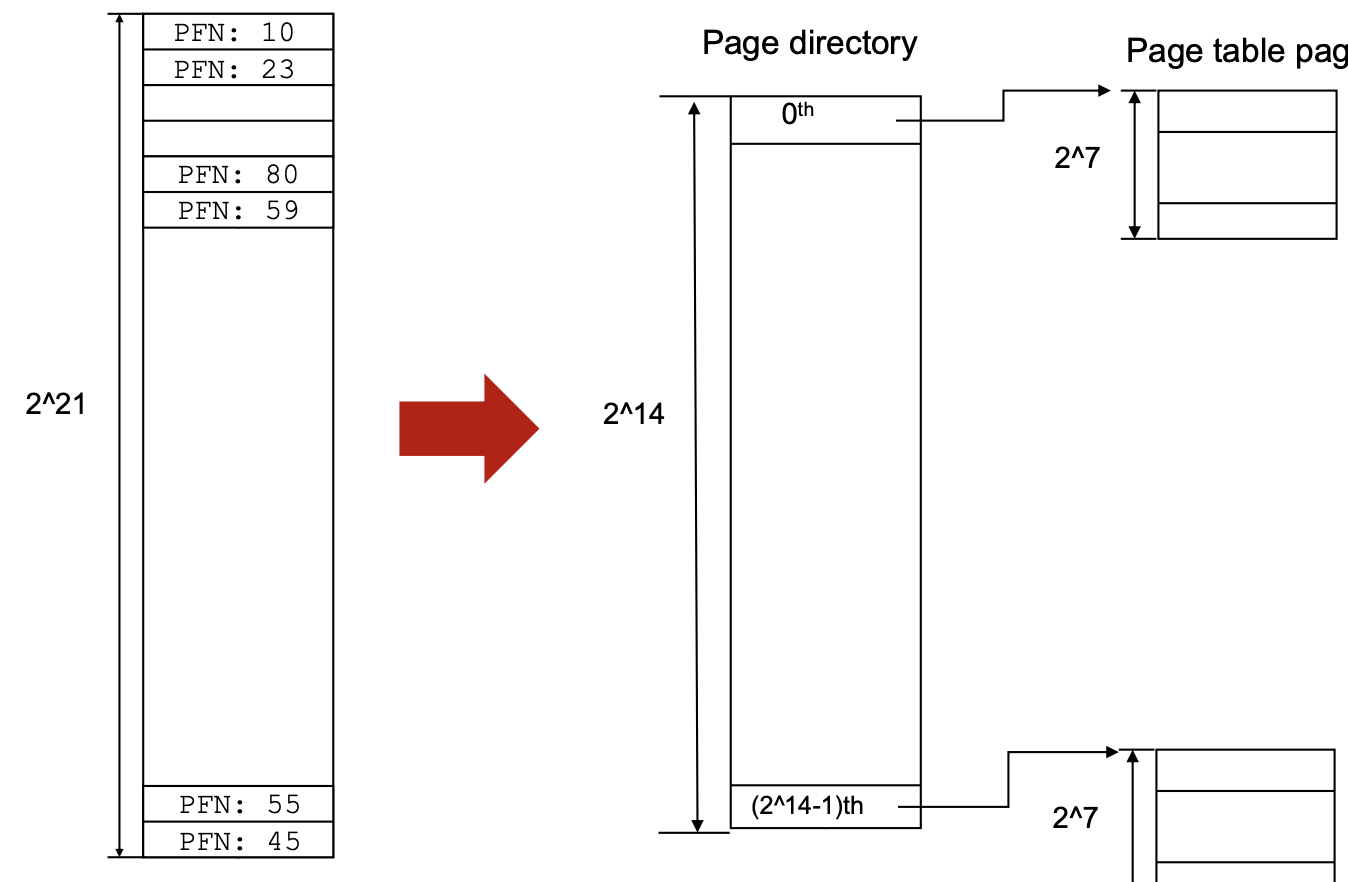 즉, Virtual Page Number(VPN) 를 넣으면 Physical Frame Number(PFN) 가 나오는 구조다.근데 여기서 문제가 생긴다. 프로세스가 많아지고 주소 공간이 커질수록, 프로세스마다 이런 테이블을 하나씩 들고 있으면 메모리가 터져버린다.