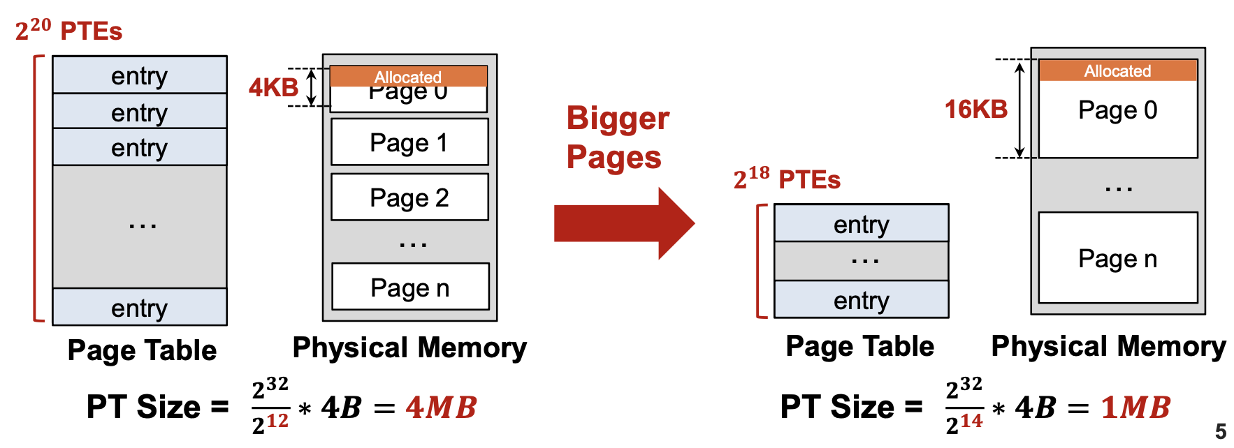 실제로 페이지 크기를 4KB에서 16KB로 키우면, 32비트 주소 공간에서 PTE 개수가 4분의 1로 줄어든다. (당연하다. 페이지 크기를 4KB에서 16KB로 키우면, 한 페이지가 담당하는 주소 범위가 넓어지므로 전체 페이지 수가 4분의 1로 줄어든다. 즉, 32비트 주소 공간에서offset 비트가 12 → 14로 증가하면서, 가상 페이지 번호(VPN) 비트가 20 → 18로 줄어들고, 이에 따라 PTE 수도 2²⁰ → 2¹⁸개로 감소한다.)