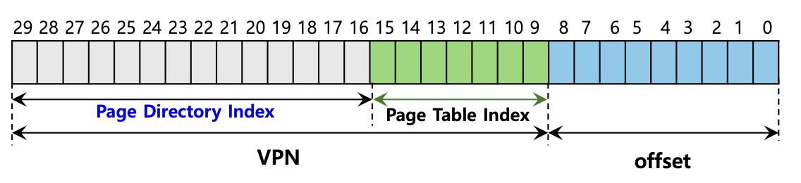 - 페이지 크기가 2^12B니까 offset은 12bits