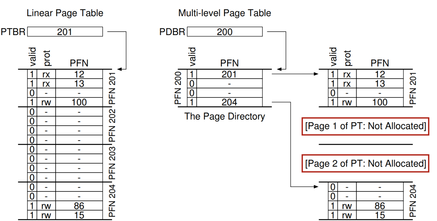 Linear Page Table 16개의 페이지 Multi-Level Page Table 3개의 페이지만 필요 (1 Page Directory + 2 valid Page Table Pages) 안 쓰는 페이지 테이블을 만들지 않아서 메모리 절약이 가능하다는 걸 보여준다. (코드, 힙, 스택만 쓰니까 2개만 유효)