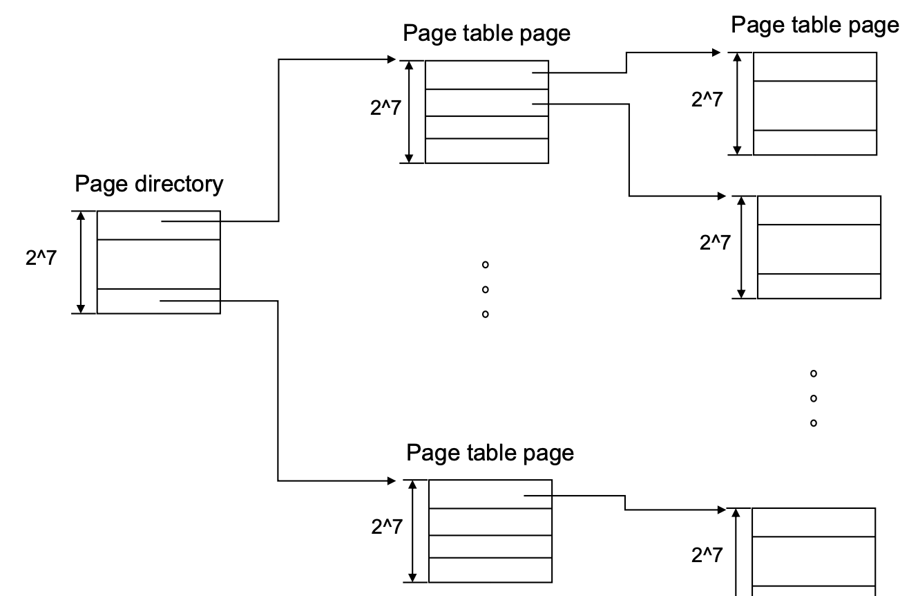 상위 7비트 1st Directory Index 최상위 디렉터리에서 어떤 Page Directory를 볼지 중간 7비트 2nd Directory Index 그 Page Directory 안에서 어떤 Page Table Page를 볼지 하위 7비트 Page Table Index 해당 Page Table Page 안의 어떤 PTE를 볼지 마지막 9비트 Offset 512B 페이지 내부 주소 각 테이블(Page Table, Page Directory, Top Directory) 모두 → 자기 자신이 한 페이지(512B)에 꼭 맞게 설계되어 있음.