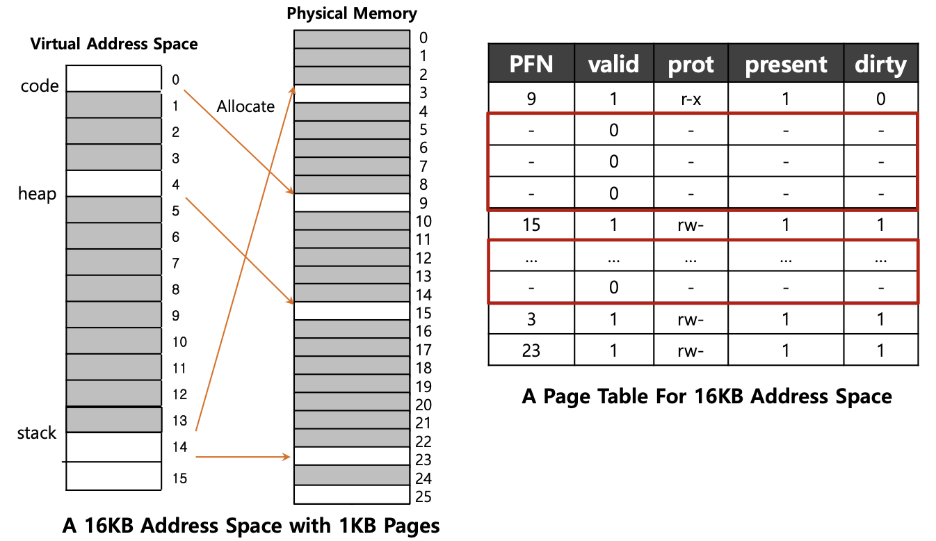 16KB 주소 공간에서 실제로 유효한 페이지는 코드, 힙, 스택 몇 개뿐이다. 나머지 대부분은 전부 invalid 상태다.