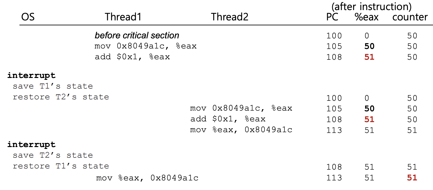 - Thread 1: counter(50)을 레지스터에 로드